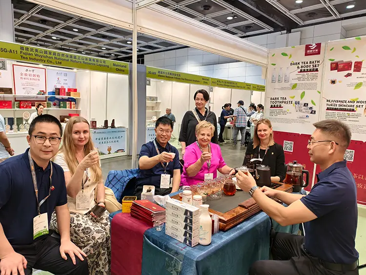 香港作为重要的世界免税自由贸易中心,毗邻亚洲主要农产品产地,又是全球重要的茶叶集散地,是理想华莱拓展国际市场的最佳渠道。此次参展,理想华莱构建了“传统+科技”双轨产品矩阵:作为世界非物质文化遗产的茯砖茶,以23道古法工艺再现千年匠心,其标志性“金花”菌群成为展示黑茶自然发酵科技的鲜活样本;通过超临界萃取技术制成的速溶黑茶,保留原茶风味与活性成分,适配现代快节奏生活需求;黑茶牙膏、黑茶洗护沐套装等深加工制品,则将茶多酚的健康价值融入日常,赢得年轻消费群体青睐。展会期间,理想华莱展位人流如织,专业茶艺师行云流水的冲泡技艺引得中外客商驻足观赏品鉴,来自波兰的客人品尝后对理想华莱的茯砖茶爱不释手,温润的茶汤裹挟着独特香气,其琥珀般的汤色与醇厚回甘的口感,让国际友人沉浸式感受“中国黑茶之乡”的地道风味。