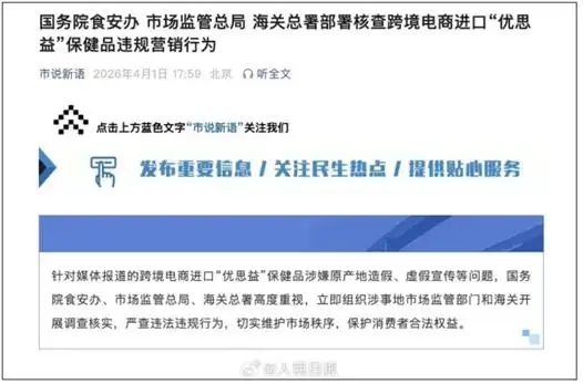 不过,好景不长,优思益的这出大戏最终还是被央视揭穿了。广东市场监管、海关、公安联合行动,杭州索象营销公司被立案,国务院食安办、市场监管总局、海关总署同步核查,三部门联合约谈平台,要求24小时下架涉事产品、全类目排查资质。