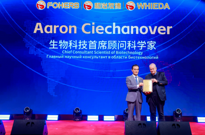 韩金明董事长向诺奖得主阿龙·切哈诺沃颁发“生物科技首席顾问科学家”聘书