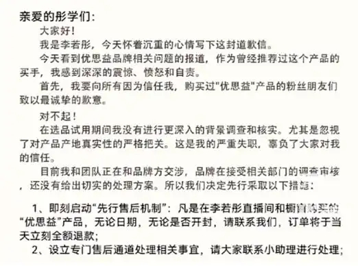 有了这身行头,优思益就开始在抖音、天猫上大肆收割韭菜了。从2019年起,它请来了李若彤,章小蕙,明道、董宇辉……等等大牌明星来代言,六七年时间下来,优思益合作过的明星网红也有几十上百了。明星们也是给力,直播间里拿着商家提供的包装资料就一顿猛夸,连澳洲总部、工厂都没认真考证过,结果事后只能紧急道歉退款,这脸打的,比翻书还快。不过,明星们也不亏,佣金高达80%,这赚钱速度,比抢银行还快!